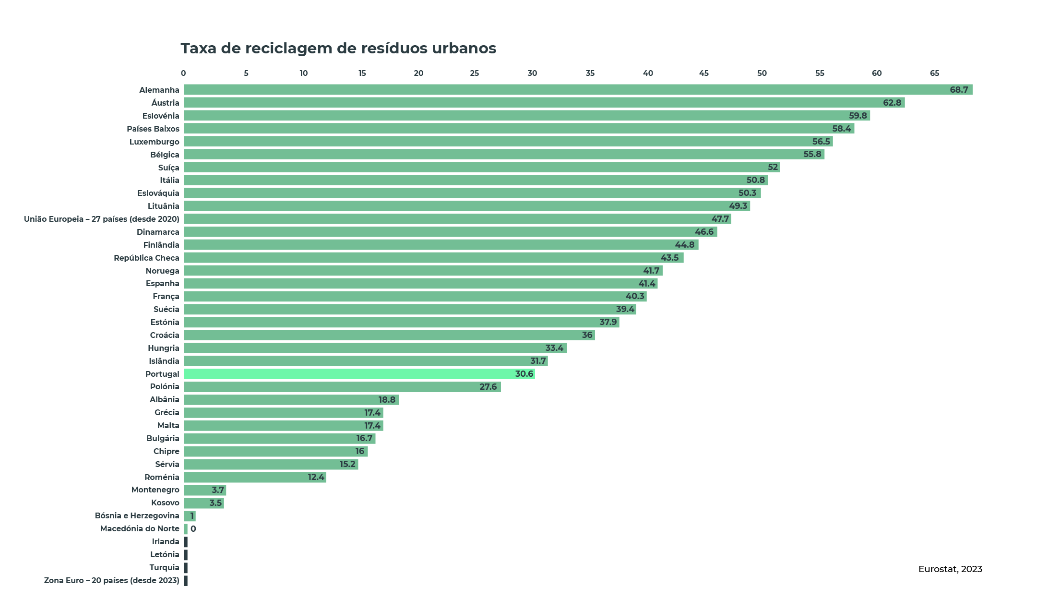 Além disto, Portugal continua na metade de baixo da tabela europeia no que respeita à taxa de reciclagem de resíduos urbanos, com valores em torno dos 30%, face a uma média da União Europeia próxima dos 50%. Mais de metade dos resíduos urbanos continuam a ter como destino final os aterros, que estão a esgotar a sua capacidade.