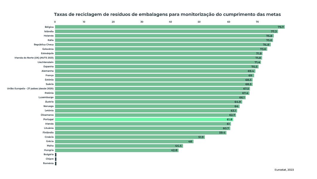 No contexto europeu, Portugal surge em 21º lugar no ranking da taxa de reciclagem de embalagens, abaixo da média da União Europeia, de acordo com os dados do Eurostat de 2023. Gera níveis de resíduos de embalagens próximos da média, mas ainda não consegue transformar essa produção em reciclagem ao ritmo que as novas metas exigem.